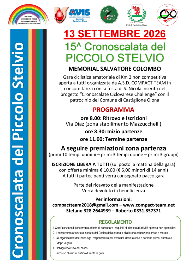 Asd Compact Team in collaborazione con Roberto La Monaca, Famiglia Colombo, ALKA, AVIS di Castiglione Olona, Gruppo Alpini di Castiglione Olona e con il Patrocinio del Comune.